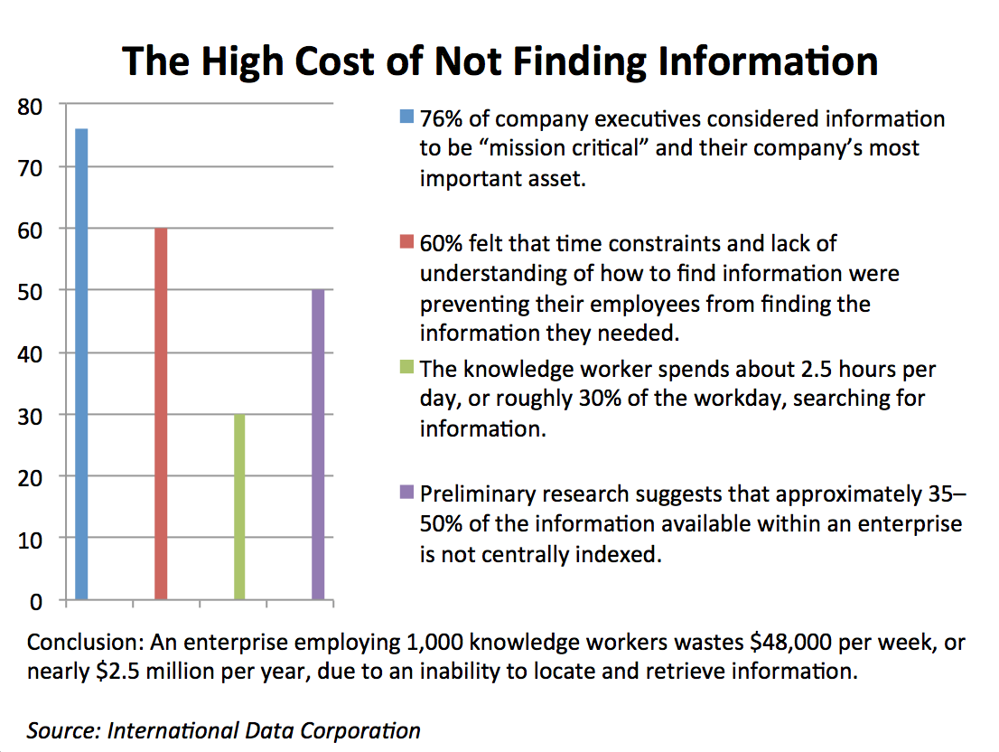 “The average knowledge worker spends 2.5 hours per day or 30% of their work week looking for information.”