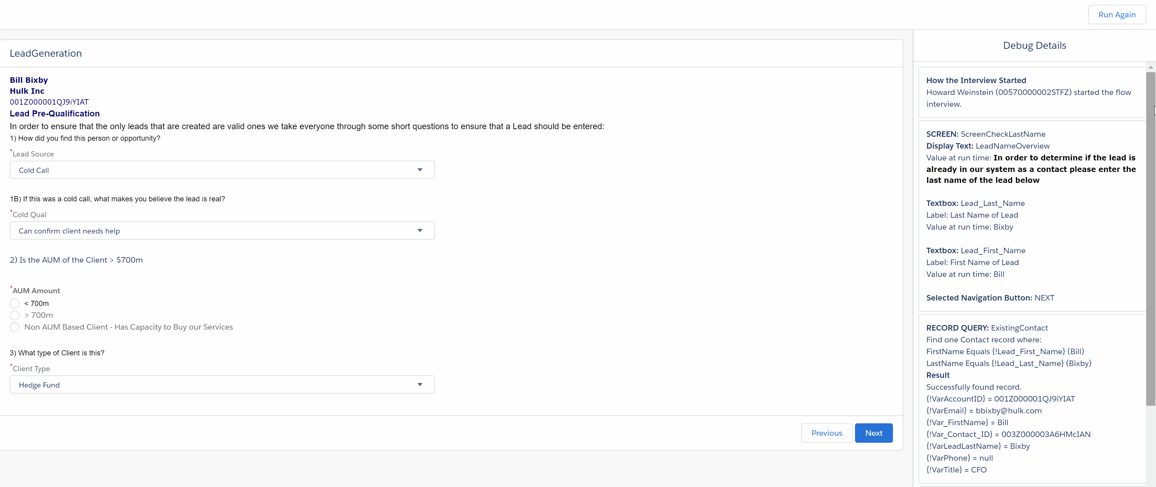 One of the best innovations in the Flow Builder is the addition of a Debugging Tool that allows you to trace through the progression of your Flow as you make entries into your forms. This is especially handy in flows where you may have created multiple decision points, or where you may have created complex formulas to calculate or assign certain values to fields in your objects. Previously, you more or less had to guess how this was occurring. Now with the debugger, you get an amazingly detailed screen on the right-hand side that tells you what element in the flow has executed and the reason why, and also shows you the value of each of your variables in that step.