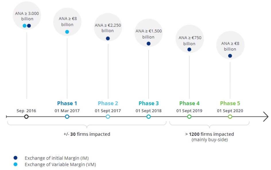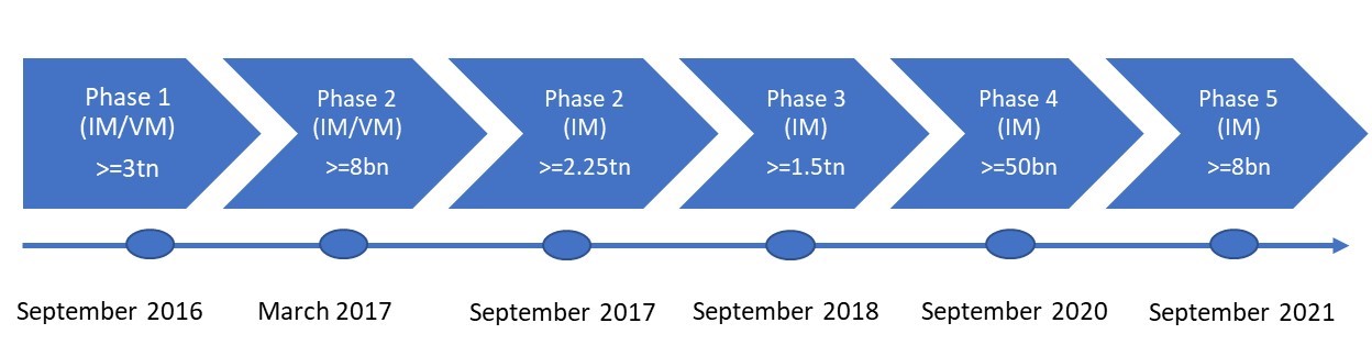 The initial implementation of Variation Margin (VM) requirements was implemented in 2017, while Initial Margin (IM) requirements continue to be phased in until 2021. The new IM rules that are to be put into effect in 2020 and 2021 affect primarily smaller financial organizations, including buy-side participants. Note that UMR has been phased in since September 2016 in the US and March 2017 for remaining market participants.